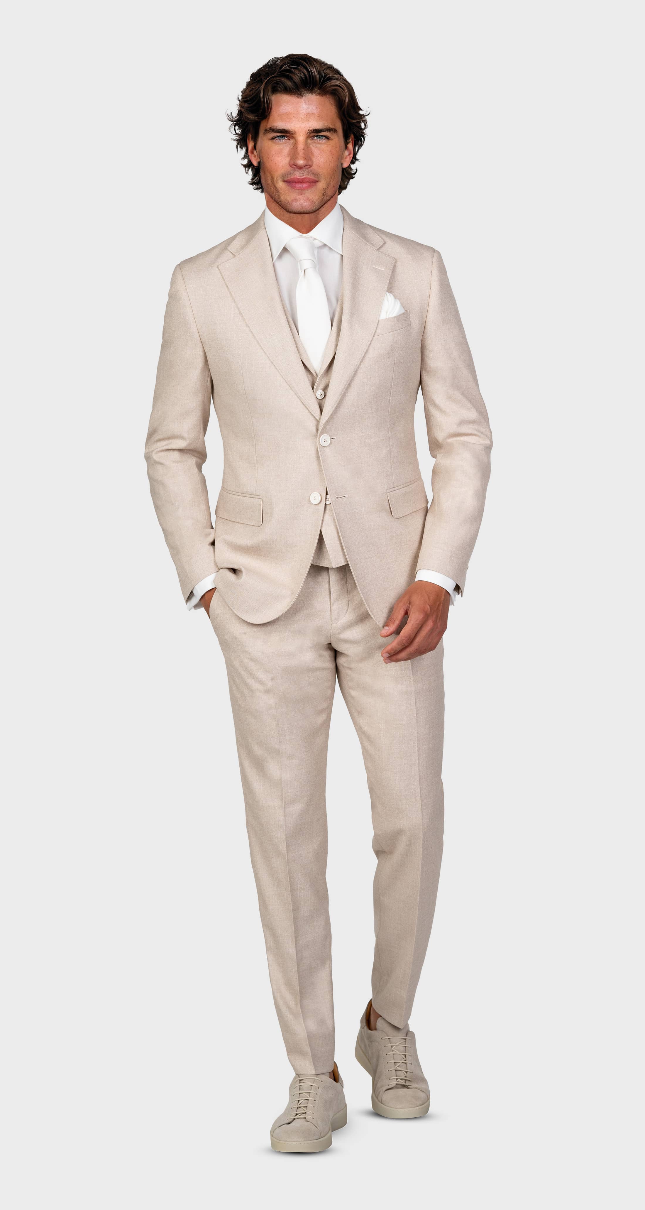 Dit stijlvolle beige drie-delige trouwpak (model 00037071) biedt een frisse, moderne uitstraling voor de modebewuste bruidegom. De lichte kleur maakt het pak perfect voor voorjaars- en zomerbruiloften, en dankzij de tijdloze snit is het ook na de grote dag veelzijdig door te dragen.